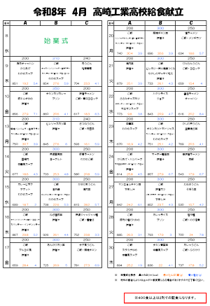 4月6日(月)、令和8年度給食献立表4月をアップしました。